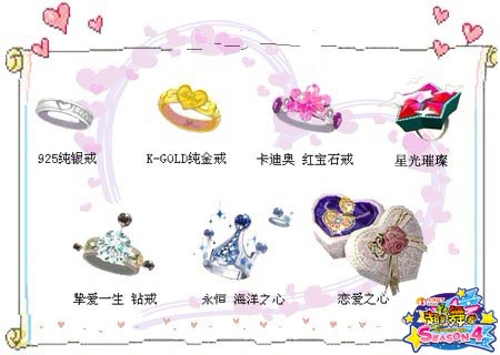 商城中可以随时买到的戒指。银戒指象征着皎洁的月亮;金戒象征着火红的太阳;钻石戒指象征着永恒的爱。“挚爱一生”“海洋之心”“恋爱之心”每一颗闪耀的钻石都代表着一颗炽热的心。还有别具一格的“星光璀璨”佩戴上它,闪烁的花环萦绕在你周围,别有一番韵味浮上心头。